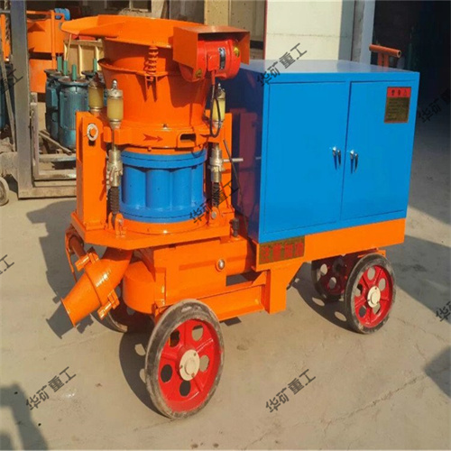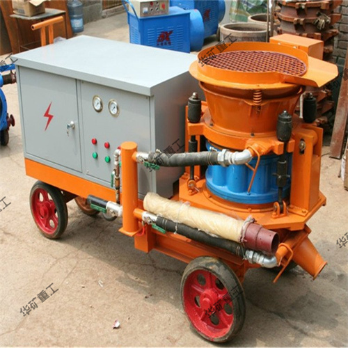 干式噴漿機簡稱干噴機,是將一定比例的水泥、砂子及小石子均勻攪拌后,借助壓縮空氣為動力,使拌合料連續(xù)地沿著輸送管路被吹送到噴射嘴處。與來自壓力水箱的壓力水混合成為半濕的混凝土,以每秒80~100米的速度噴射到工作面上,使之達(dá)到襯砌的效果。噴射時,噴嘴一般距離工作面1米左右,一邊噴射,一邊慢慢畫圈移位。