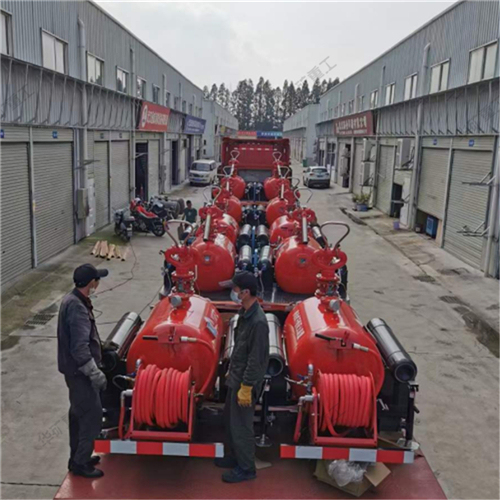 移動干粉滅火裝置,以高壓氮氣為動力,將儲罐內(nèi)干粉滅火劑通過干粉炮或干粉槍噴向保護對象,由于干粉的比重較大,在氣流的作用下能覆蓋到火上不致被氣流沖散。干粉在火焰的作用下破壞了原有的結晶,以新的化學物質(zhì)中斷了燃燒的鏈式反應,窒息火焰,同時干粉在分解過程中大量吸熱,使著火區(qū)域溫度迅速下降,從而控制撲滅火災。